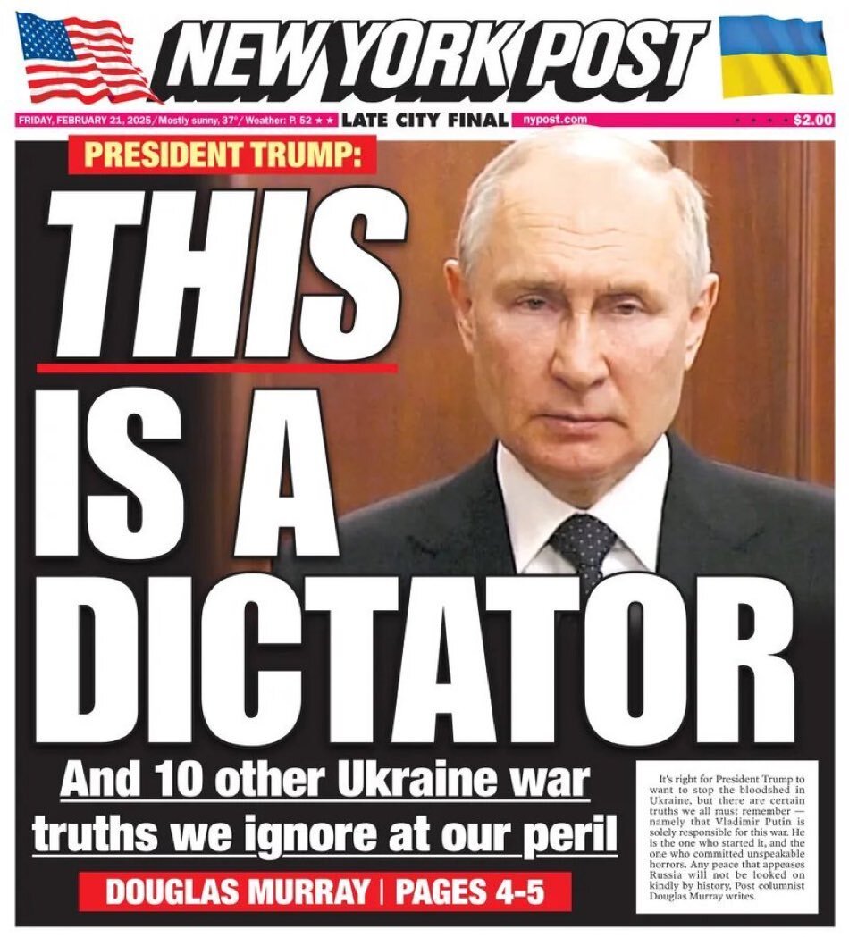 📍 صحيفة نيويورك بوست نشرت قصة بارزة على صفحتها الأولى بعنوان “الرئيس ترامب: هذا ديكتاتور”، مع صورة لبوتين.