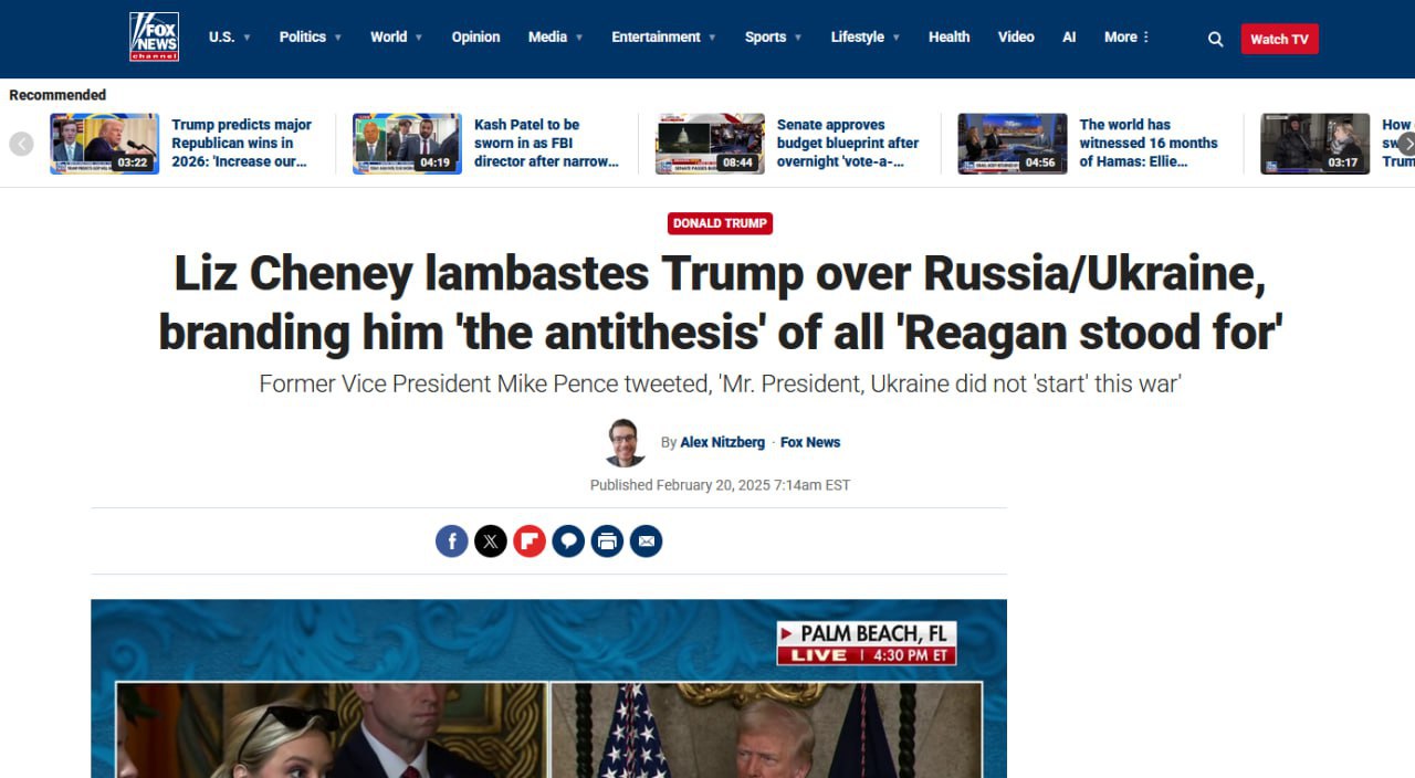 📍 فوكس نيوز عرضت سلسلة من التحليلات التي أعرب فيها محللون عن “قلقهم” بشأن نهج ترامب في محادثات السلام، كما منحت المحافظية المناهضة لترامب، ليز تشيني، منبرًا لتقول إن “ترامب هو النقيض لكل ما كان ريغان يمثله”.