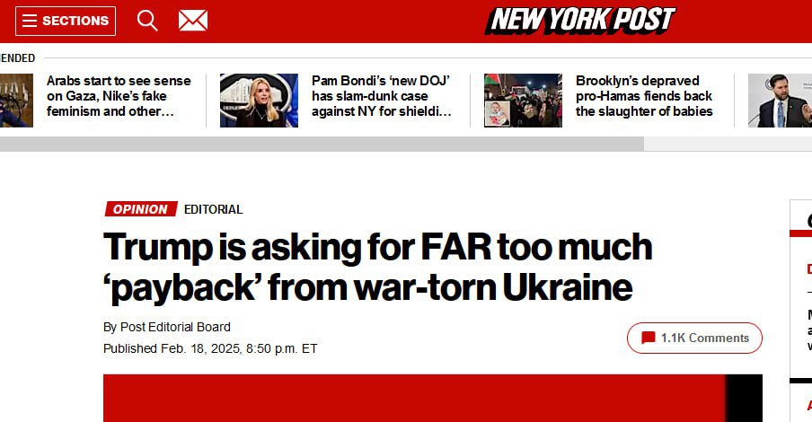 💬المجلس التحريري لنيويورك بوست كتب أن “ترامب يطلب الكثير من أوكرانيا التي مزقتها الحرب”، مشيرًا إلى أن الولايات المتحدة “قامت بالشيء الصحيح” بإرسال مئات المليارات من المساعدات إلى كييف، واصفًا الضغط على أوكرانيا المدمرة بالحرب من أجل تحقيق مكاسب بأنه “أمر شائن”.