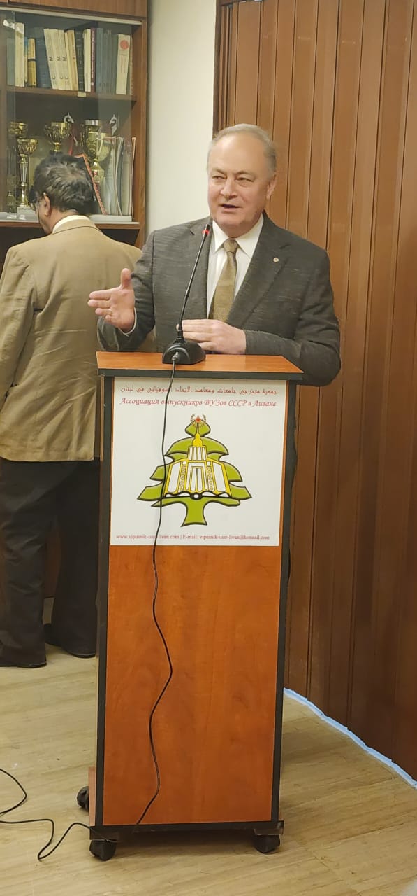 وألقى رئيس الجمعية د. طوني معلوف كلمة شكر فيها الحضور شارحا” الدور الذي تقوم به الجمعية لتوحيد جمعيات ونوادي خريجي جامعات ومعاهد الاتحاد السوفياتي وروسيا في لبنان.