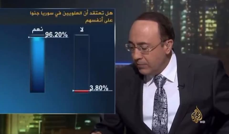يجب محاكمة قناة الجزيرة وهذا الإعلامي الإرهابي على هذا التحريض الطائفي العلني، وتبرير جريمة الإبادة التي حدثت بحق العلويين، ولكل صحفي يعمل ويخدم هذه القناة الملعونة، أنت مسؤول عن دماء آلاف الأبرياء الذين سقطوا بفعل هذه القناة وتحريضها المباشر على إراقة الدماء.