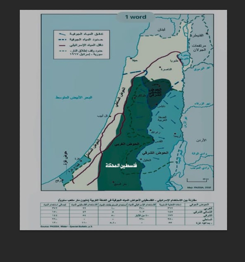 7 – يستهلك العدو الصهيوني المياه الفلسطينية في الضفة والقطاع بإفراط كبير دون مراعاة للتوازن المائي بين التغذية السنوية والاستهلاك. يسرق الكيان الصهيوني ما يزيد عن 85% من المياه في الخزان الجوفي في الضفة الغربية ما يفوق عن 483 مليون متر مكعب سنوياً. اضافة إلى 10-12 مليون متر مكعب سنوياً من مياه قطاع غزة.