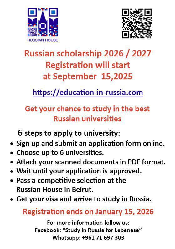 📢 البيت الروسي في بيروت: الجهة الرسمية الوحيدة لاستقبال طلبات المنح الدراسية الحكومية في روسيا للعام 2026/2027، التقديم مجاني بالكامل، ويحذر من أي جهات تطلب رسوم