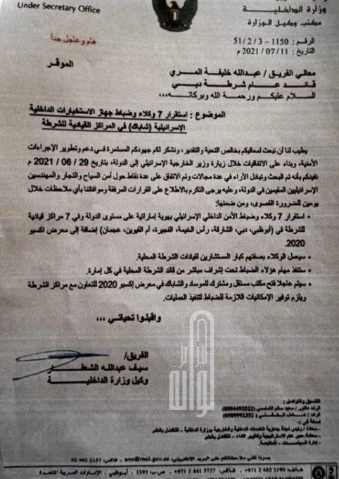 مذكرة سرية صادرة عن وزارة الداخلية الإماراتية رقم 51/2/3-1150 بتاريخ 11 يوليو 2021 تكشف عن تفاصيل عملية واسعة النطاق نفذتها المخابرات الإسرائيلية